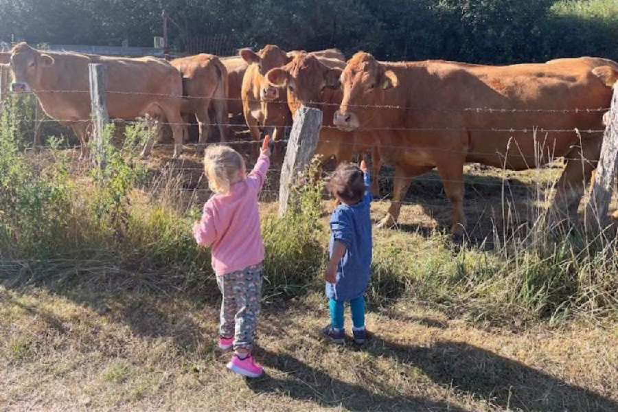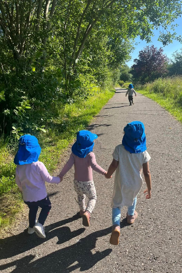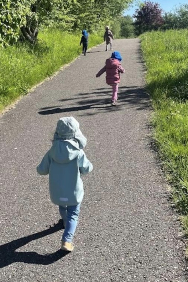 Auf unseren Ausflügen verbringen wir jeden Tag viel Zeit im Freien. Gleich morgens nach unserer Begrüßung im Morgenkreis starten wir mit unserem Bollerwagen raus in die Natur. In der näheren Umgebung befinden sich tolle Spielplätze. Auf unseren Entdeckungstouren sehen wir wir oft Hasen, Rehe, Milchkühe und andere spannende Tiere. Auch Odin, unser kleiner Hütehund, begleitet die Kinder gerne. Sie lieben es, zum Frühstück oder Mittagessen auf den Feldern und Wiesen zu picknicken.